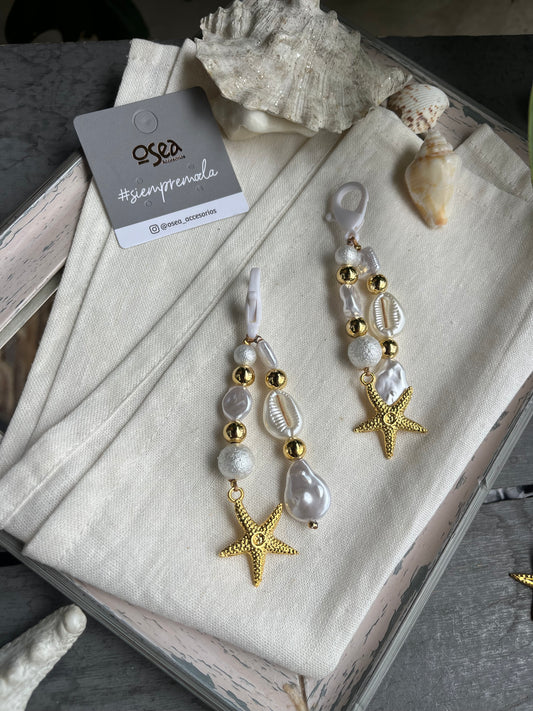 Llavero o charm en fantasía con perlas y dije de estrella de mar.