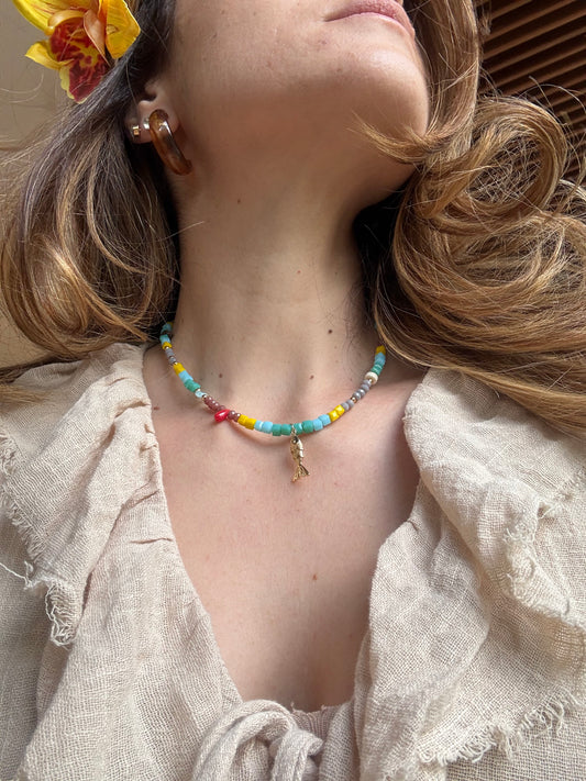 Collar corto en piedras con dije en forma de pez rodinado.