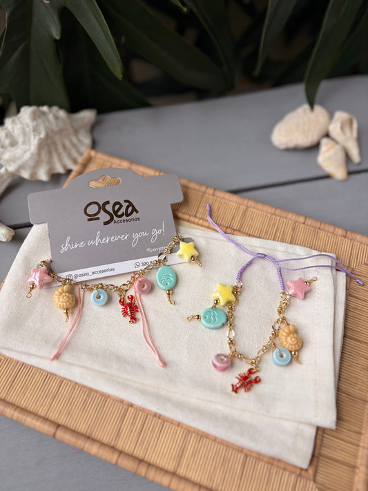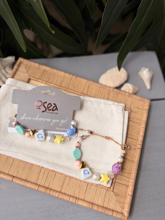 Pulsera en hilo con perlas, piedras y figuras en vidrio