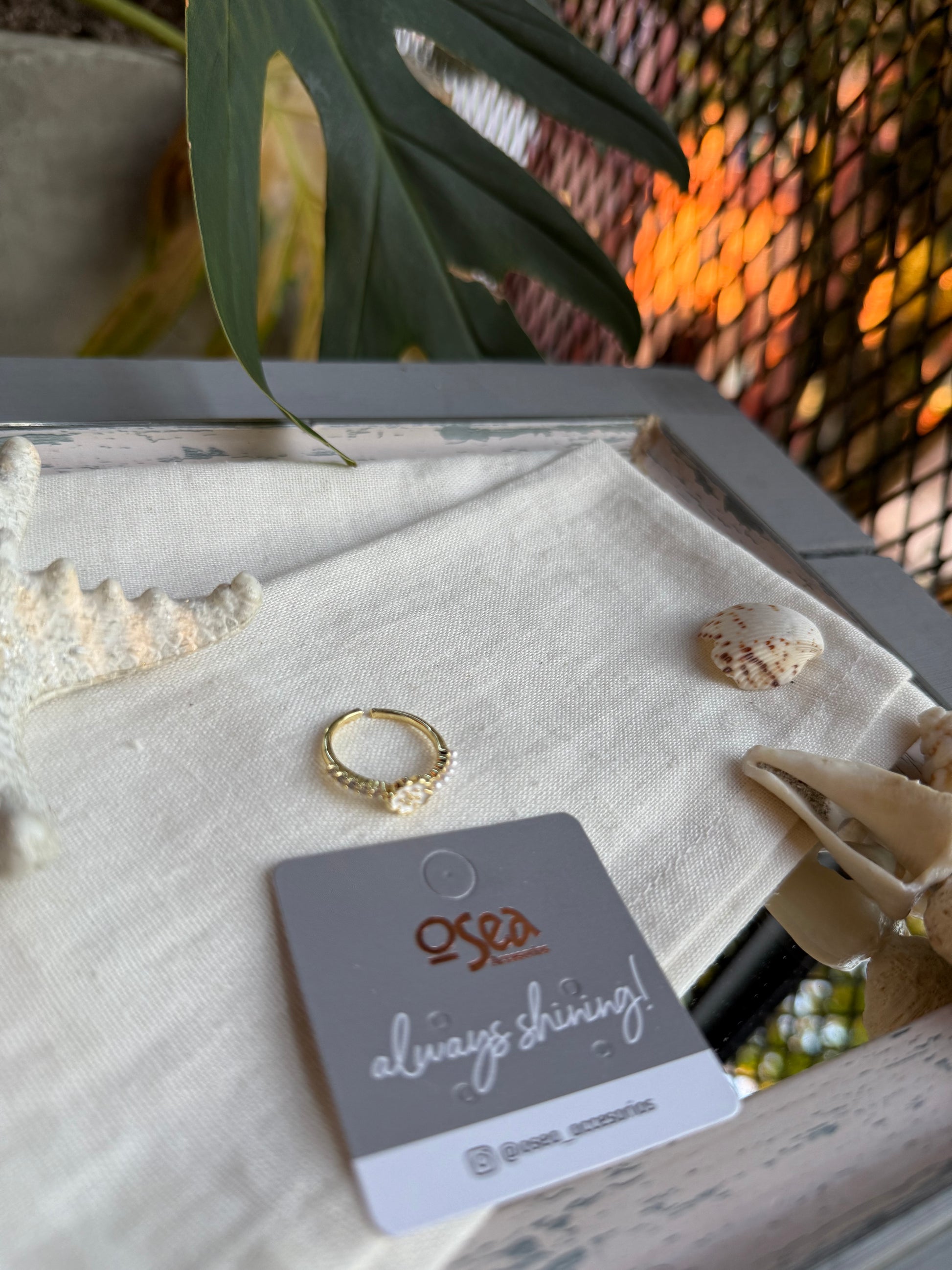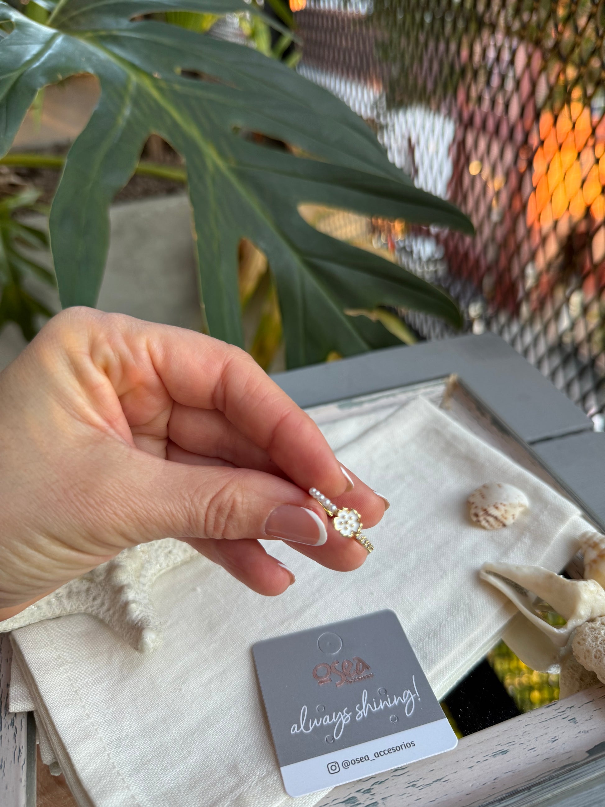 Argolla ajustable en oro golfied con diseño de flor en el centro y perlas y piedras a los lados.