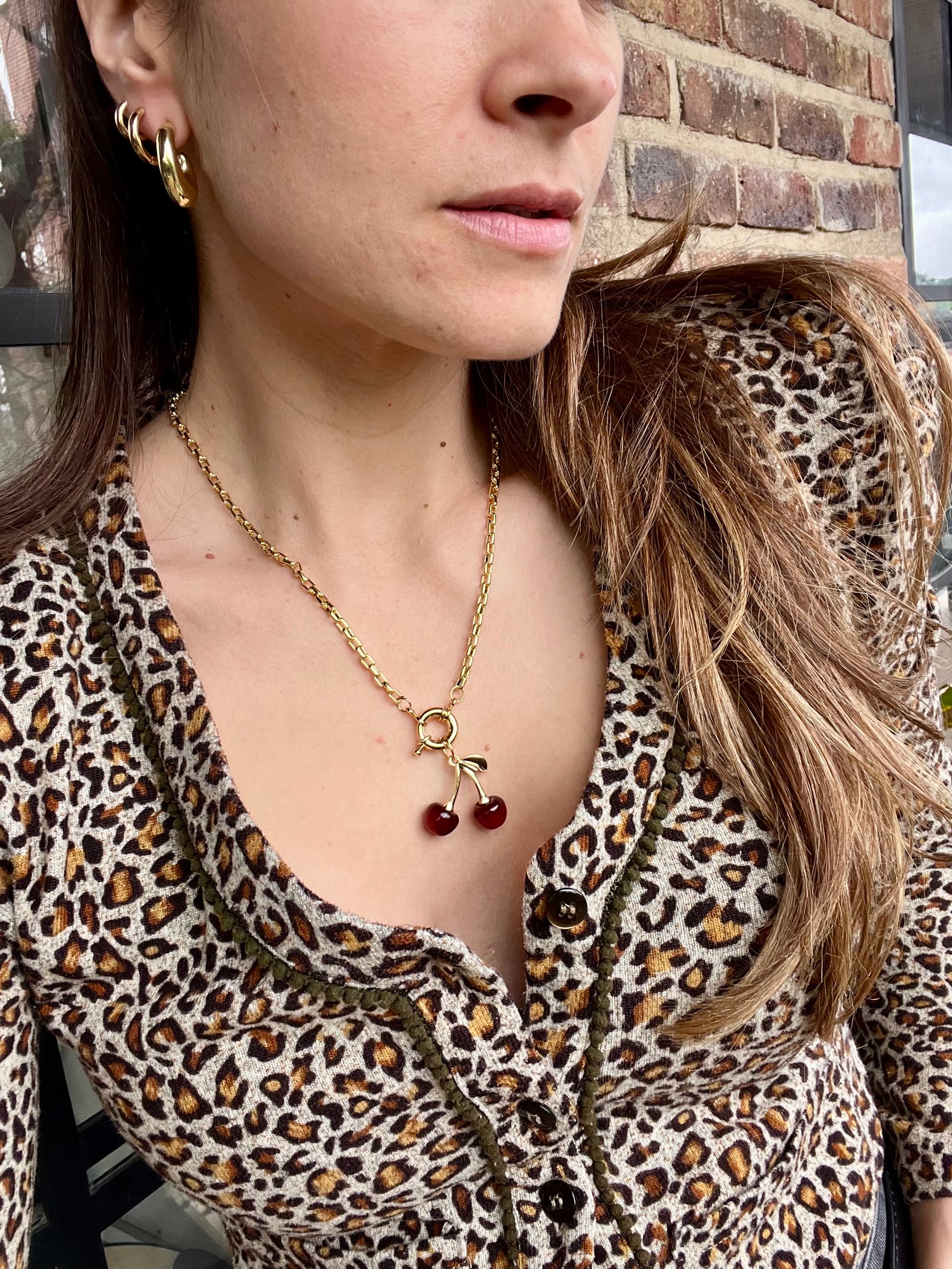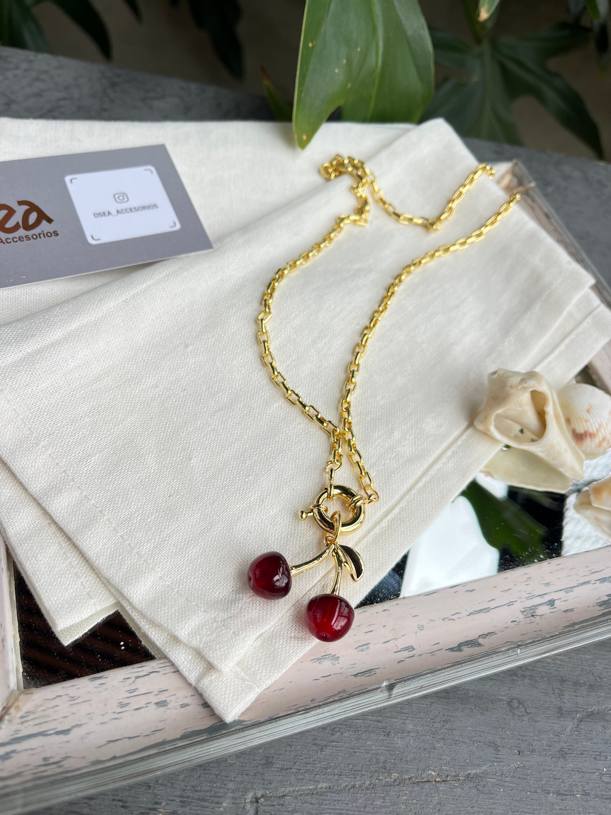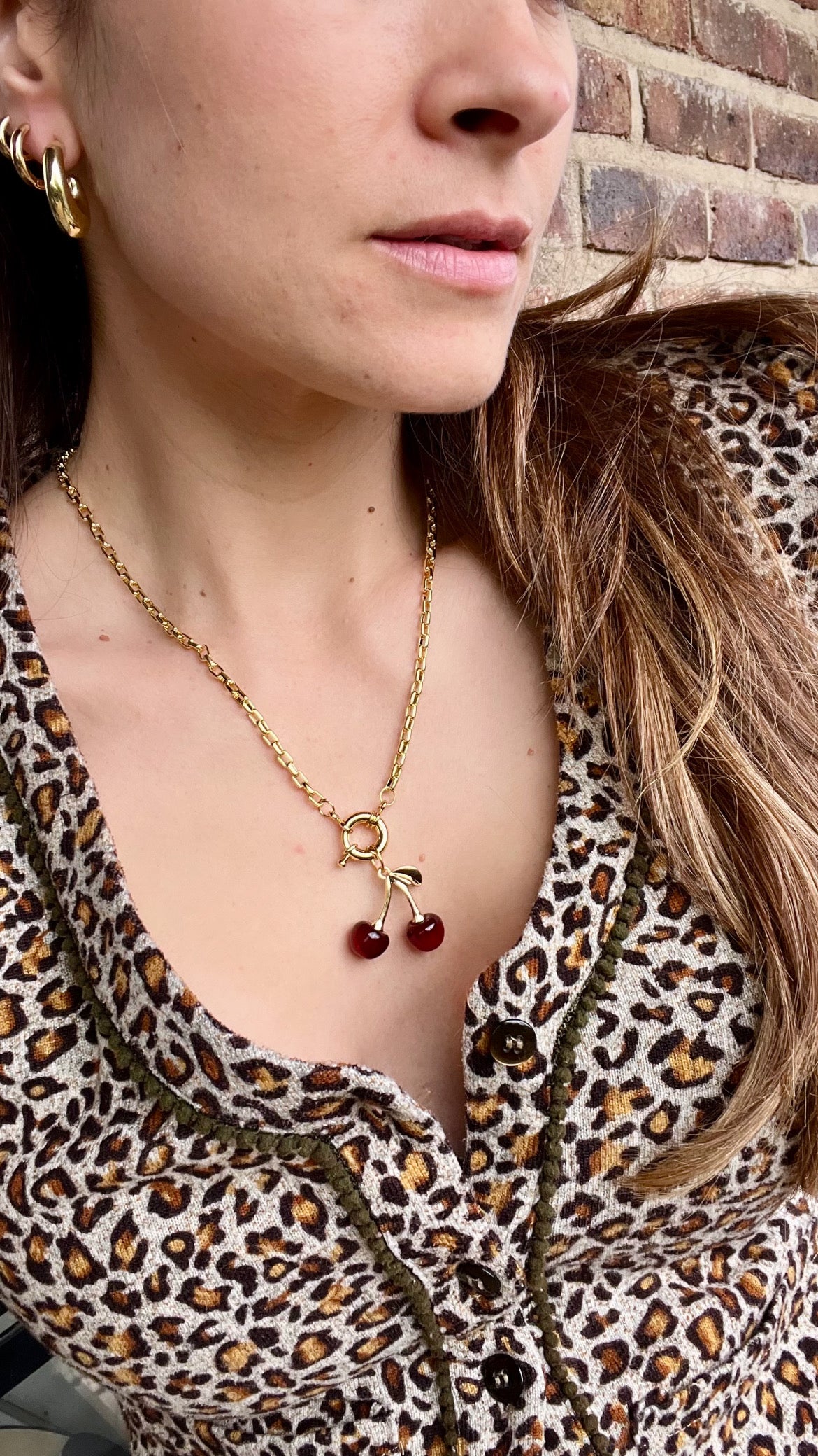 Únete a la tendencia de frutos rojos con esta hermosa cadena rodinada, con broche náutico delantero y dije de cereza mediano.