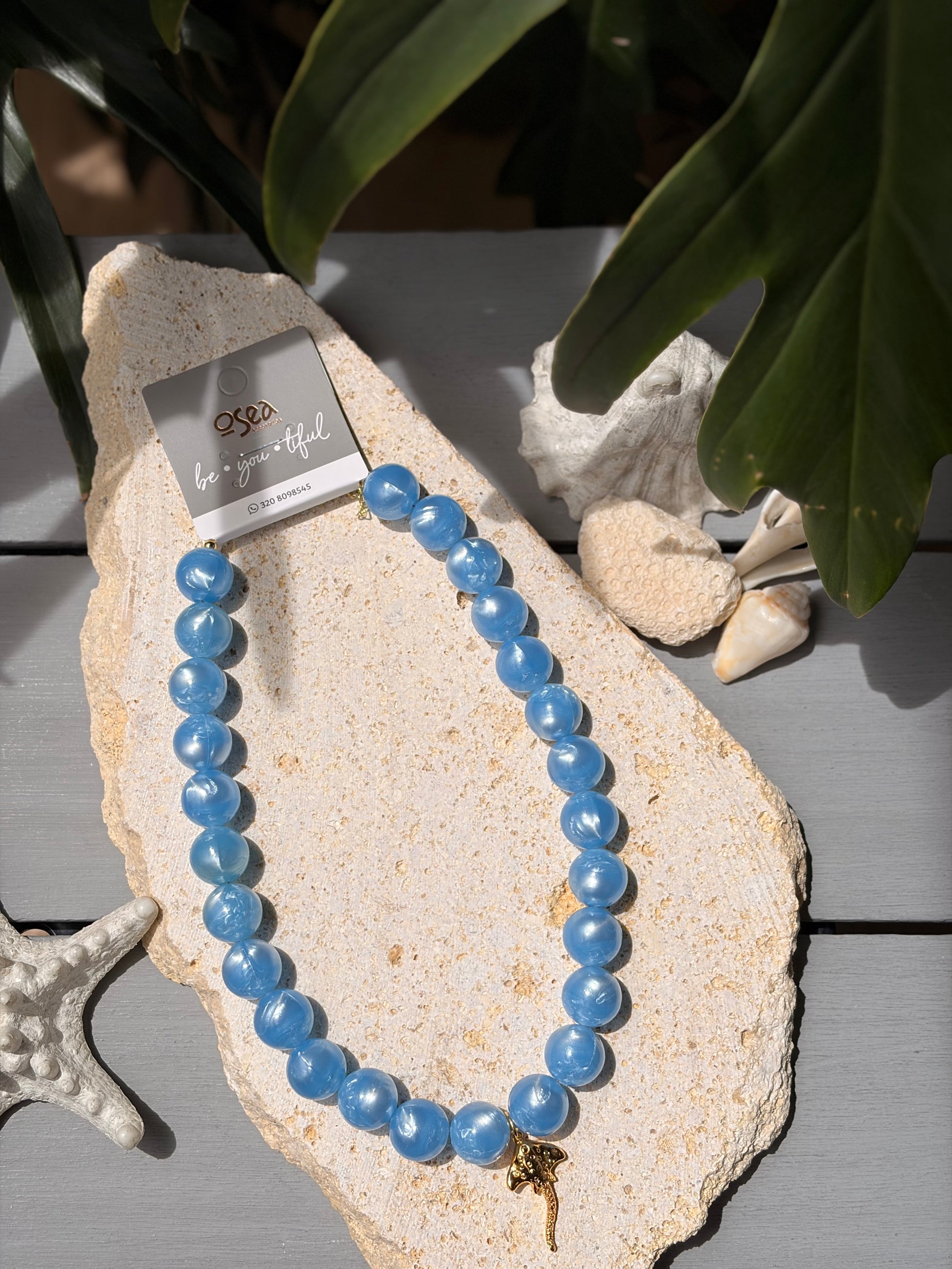 Añade un toque de sol a tu look con el Collar bolas azul nácar y su encantador dije de mantarraya. Su tonalidad azul de mar evoca la serenidad del océano, mientras que el diseño mágico simboliza libertad y elegancia. Perfecto para resaltar tu autenticidad en cada ocasión.