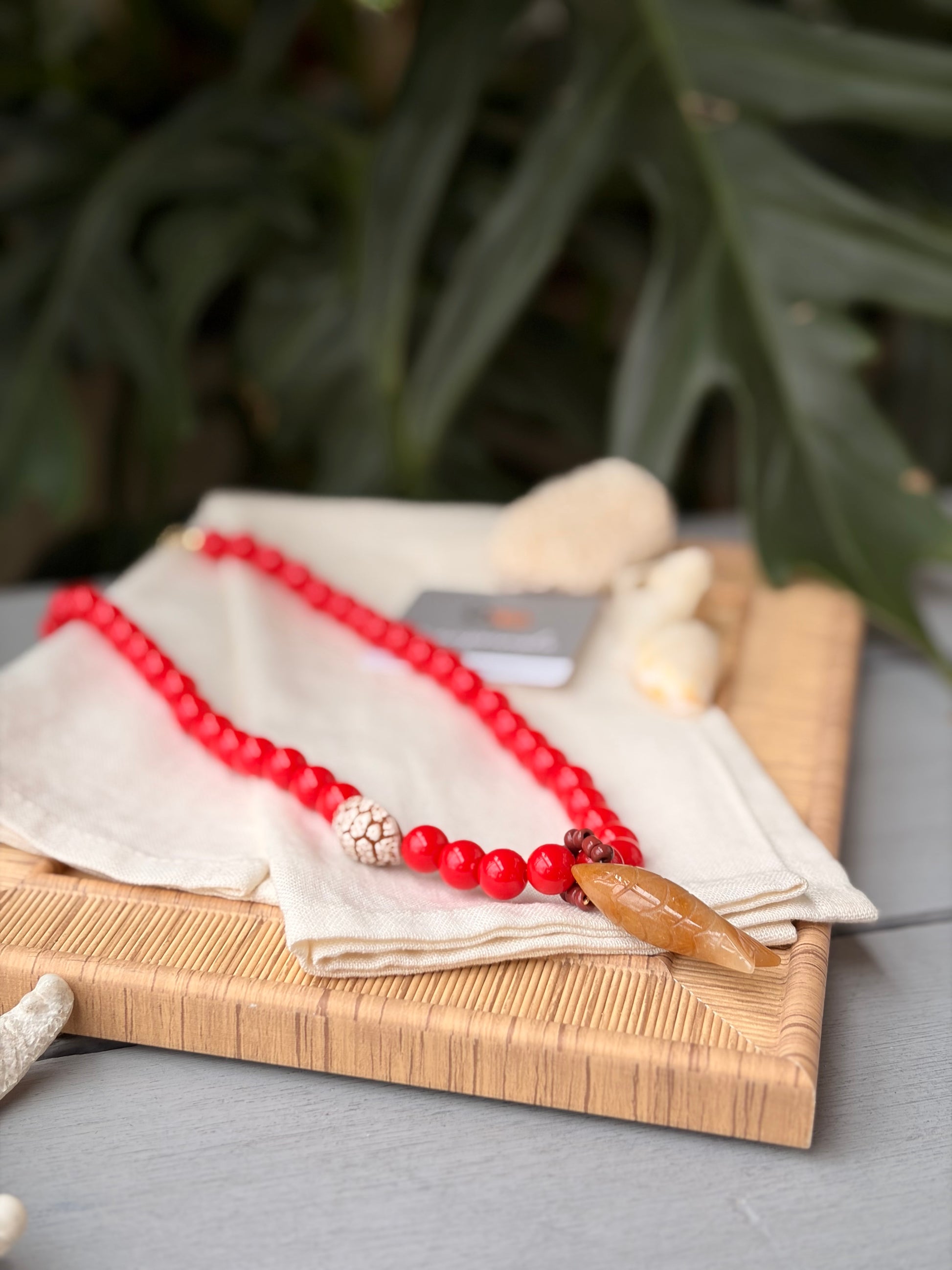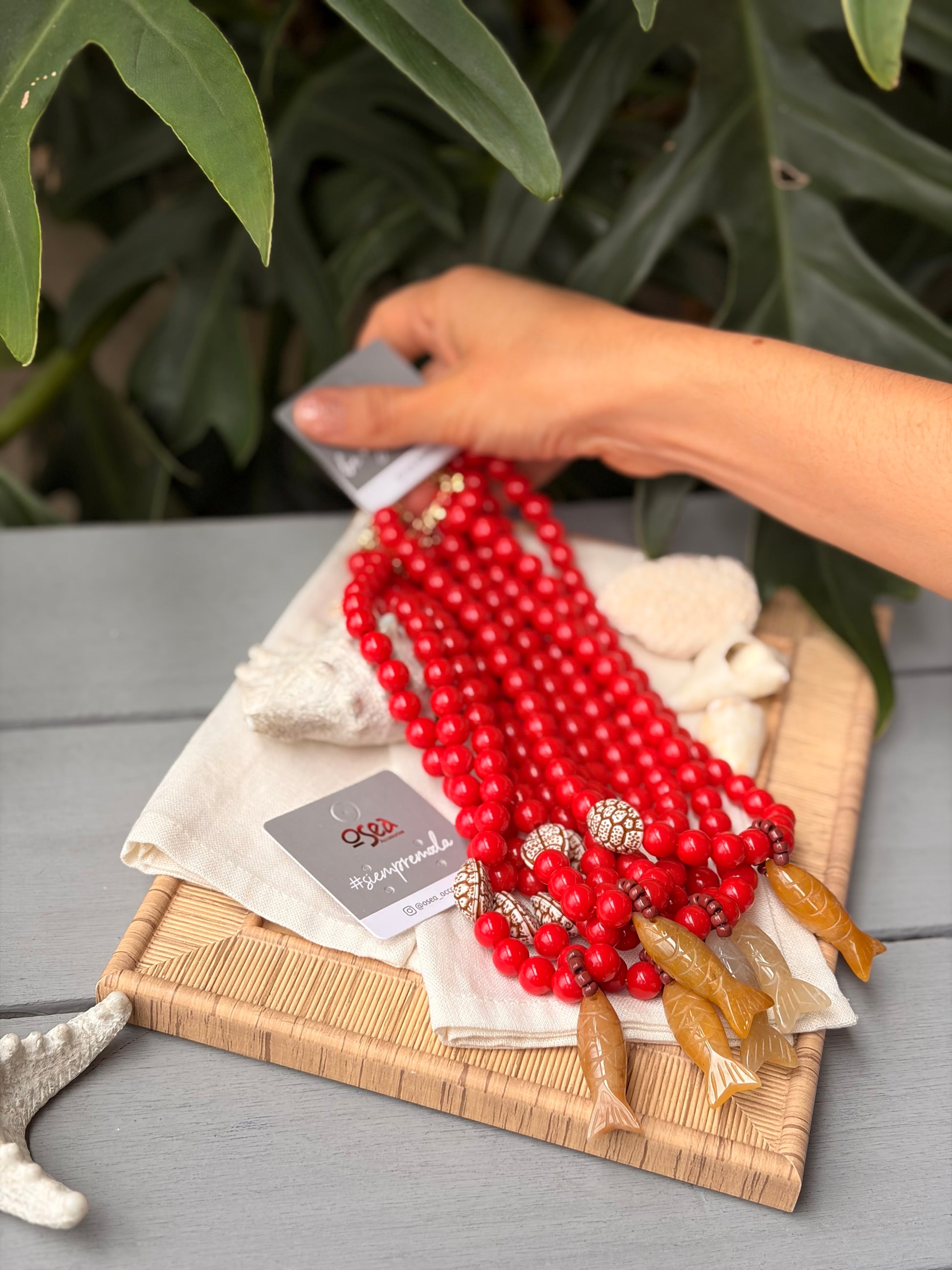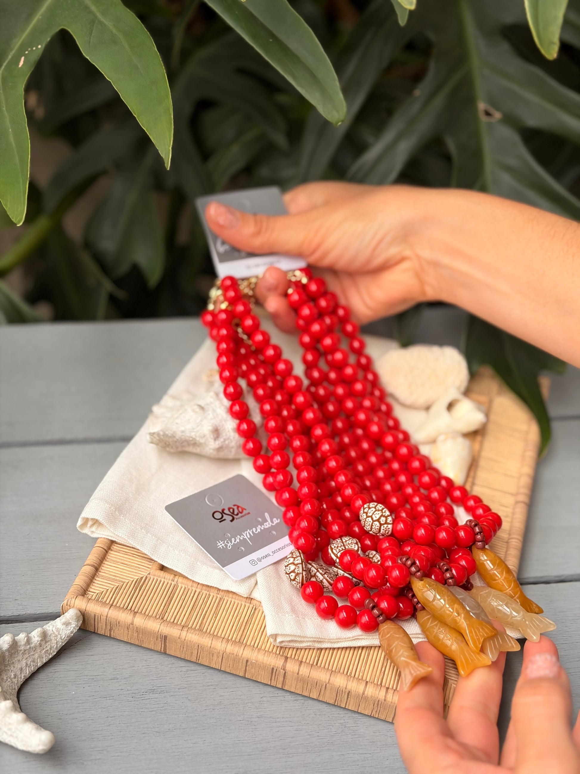 El collar presenta bolas rojas de pasión y un dije tallado en piedra natural con forma de pez. Las bolas rojas aportan un toque vibrante, mientras que el dije en piedra natural ofrece durabilidad y un diseño único. Este accesorio combina estética y resistencia, ideal para complementar diversas vestimentas.