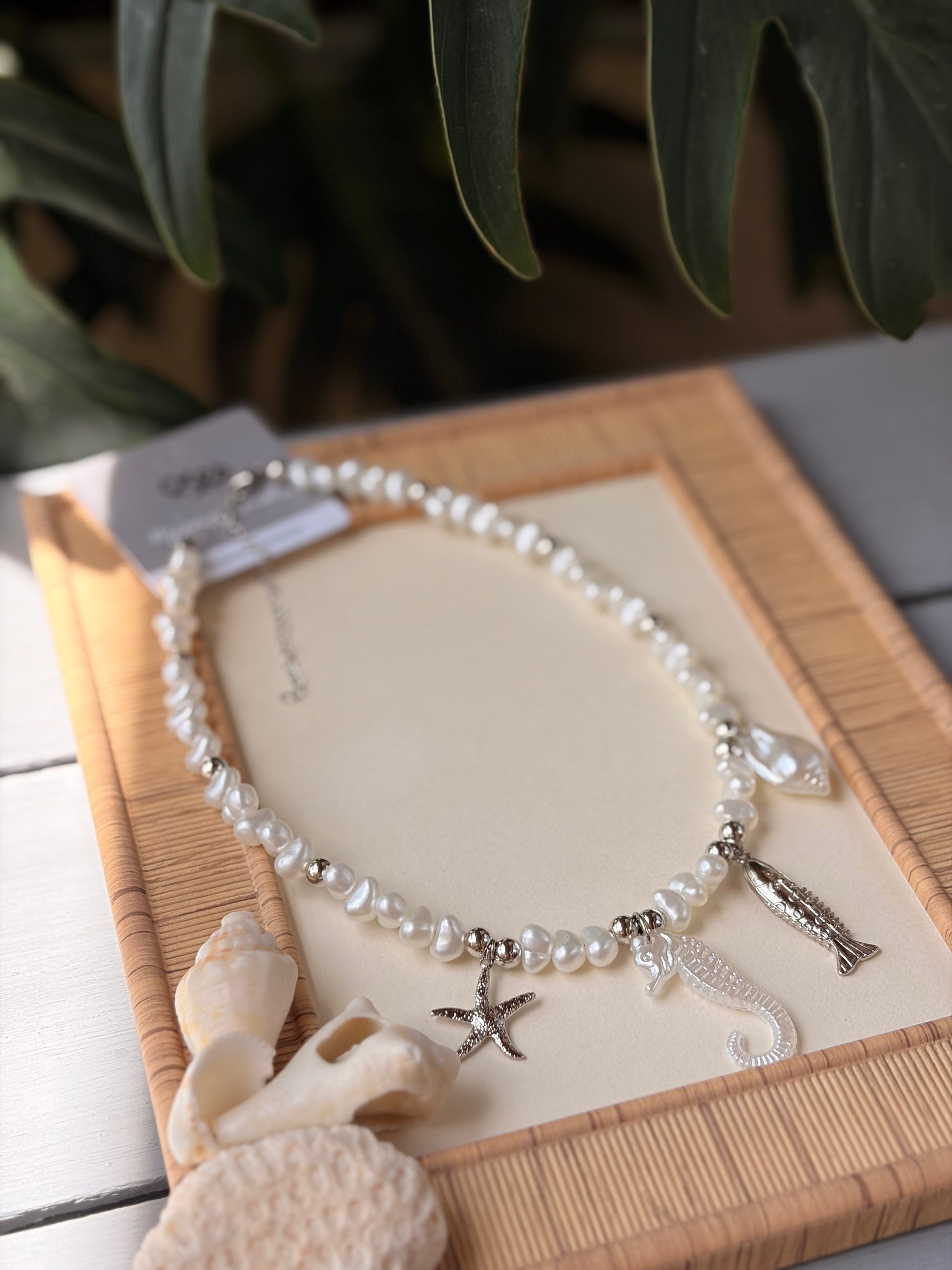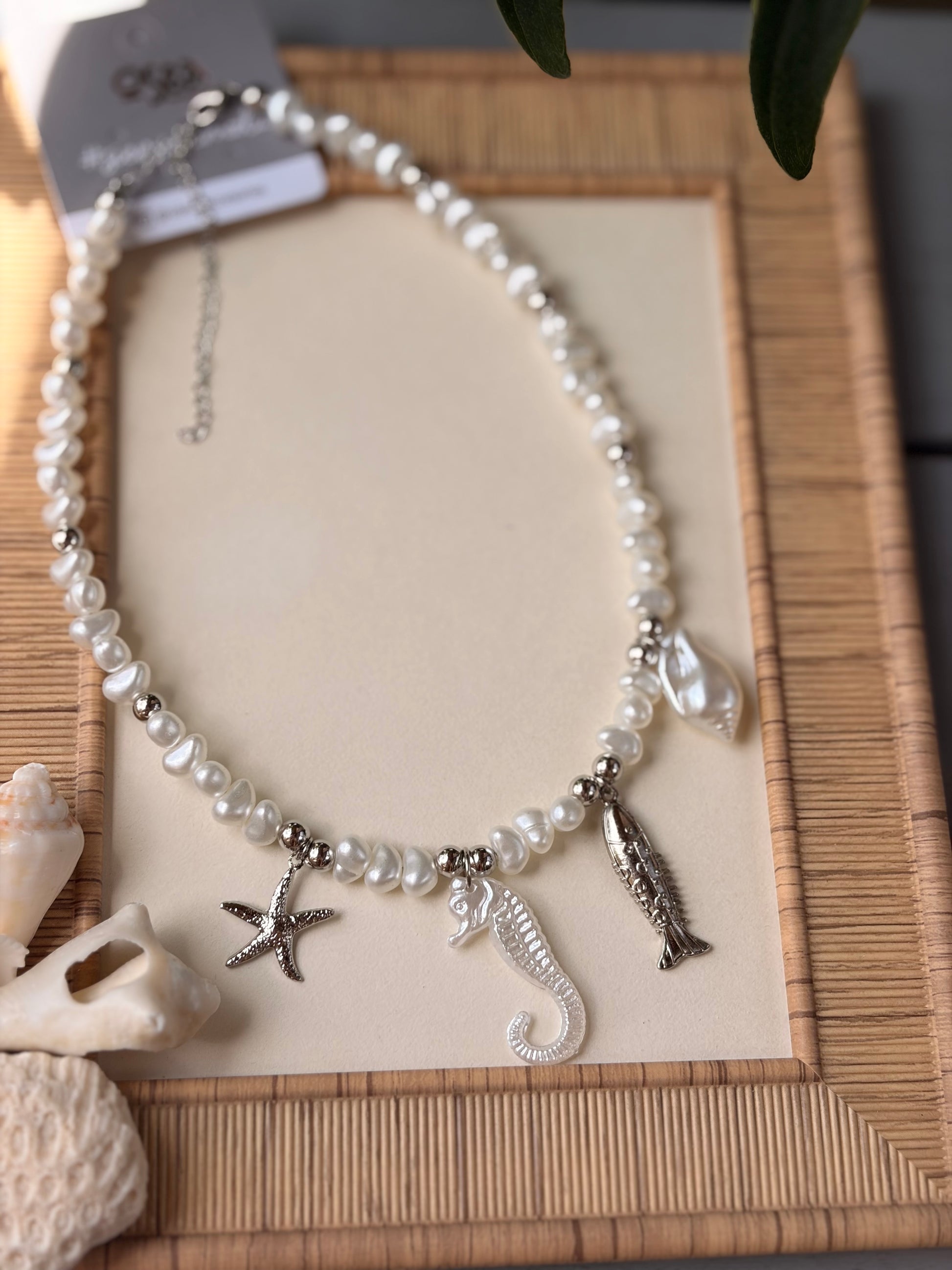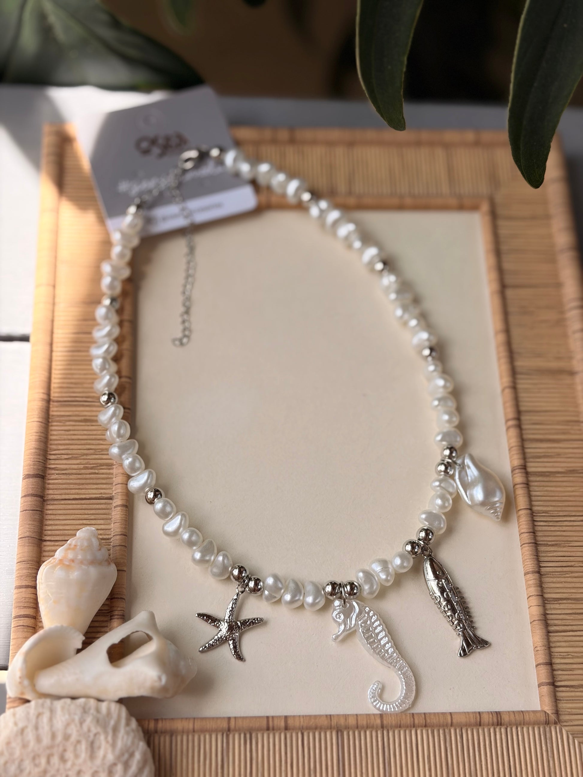 ¡Realza tu belleza con nuestro collar dijes de mar acabado perlado! Diseño único con perlas plásticas irregulares, perfecto para cualquier ocasión. Luce elegante y sofisticada con el toque plateado en tu cuello. ¡Haz una declaración con este collar imprescindible!