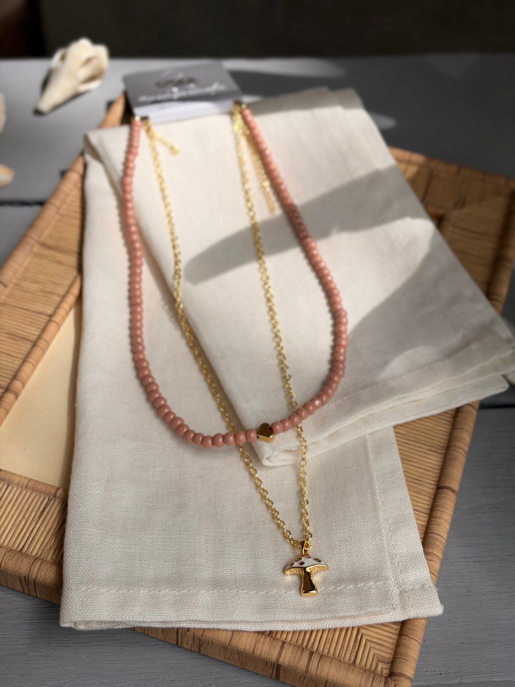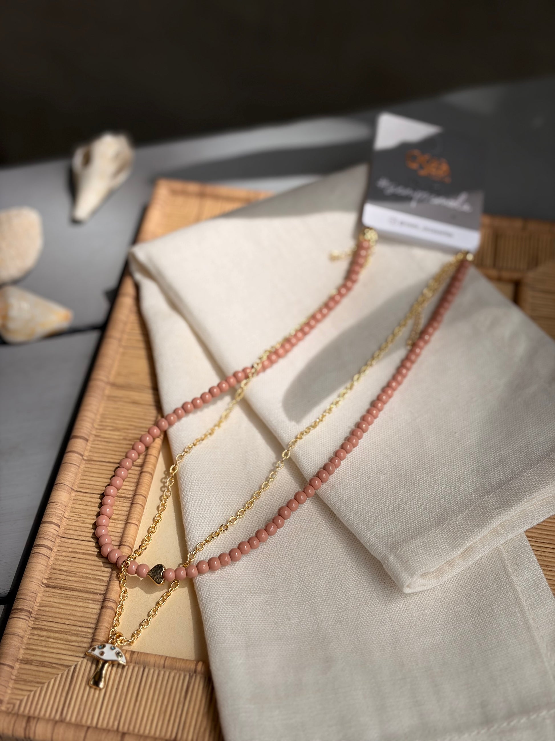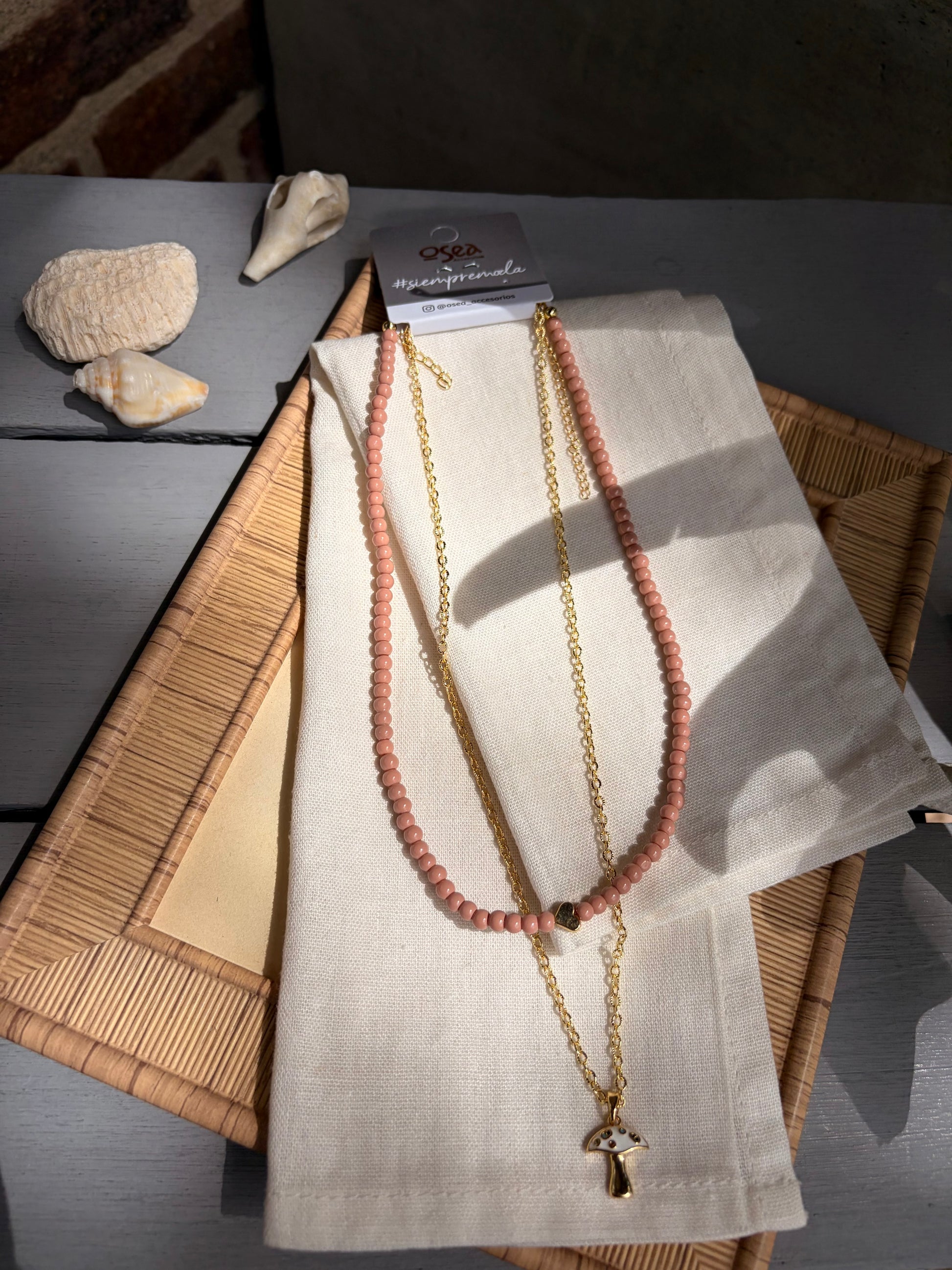 ¡Realza tu estilo con nuestro collar doble con dije de hongo! Esta pieza única incluye una cadena y un choker, perfectos para combinar con cualquier atuendo. Da un toque de originalidad y personalidad a tu look. ¡Sé auténtica!