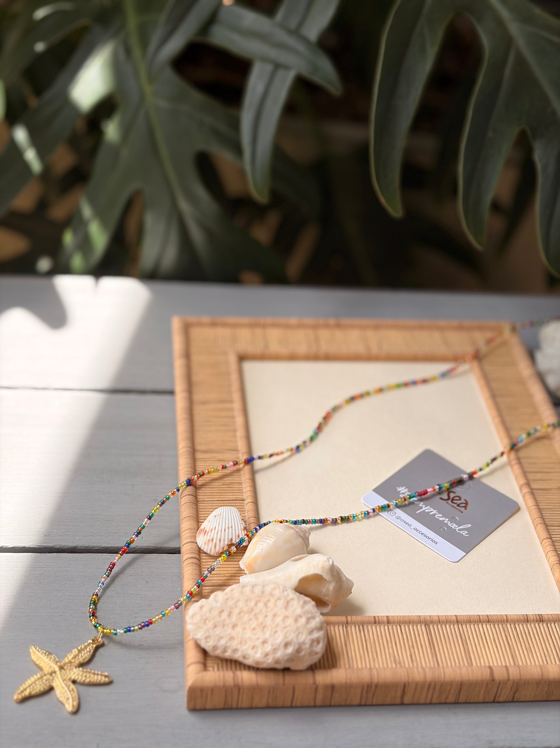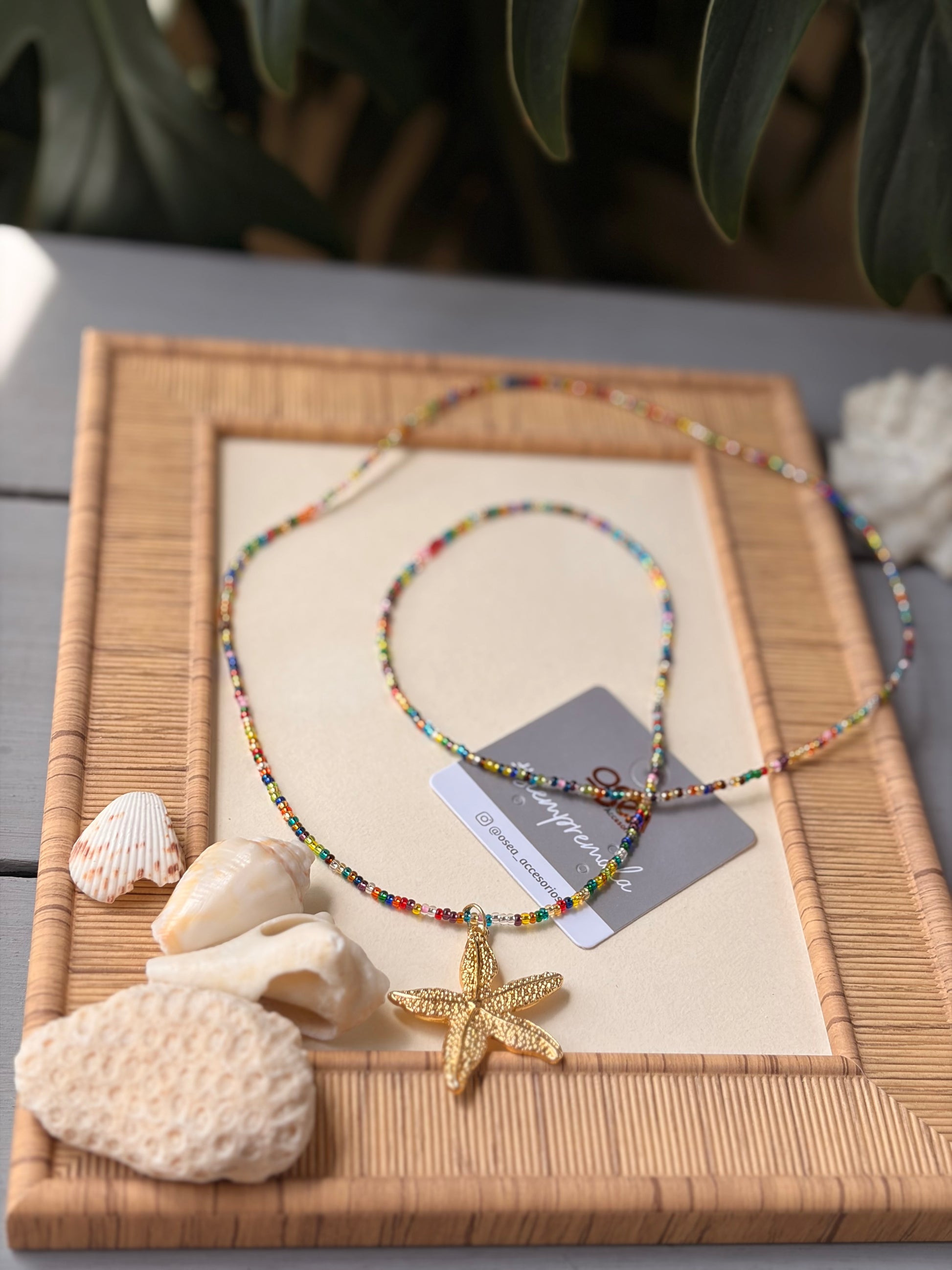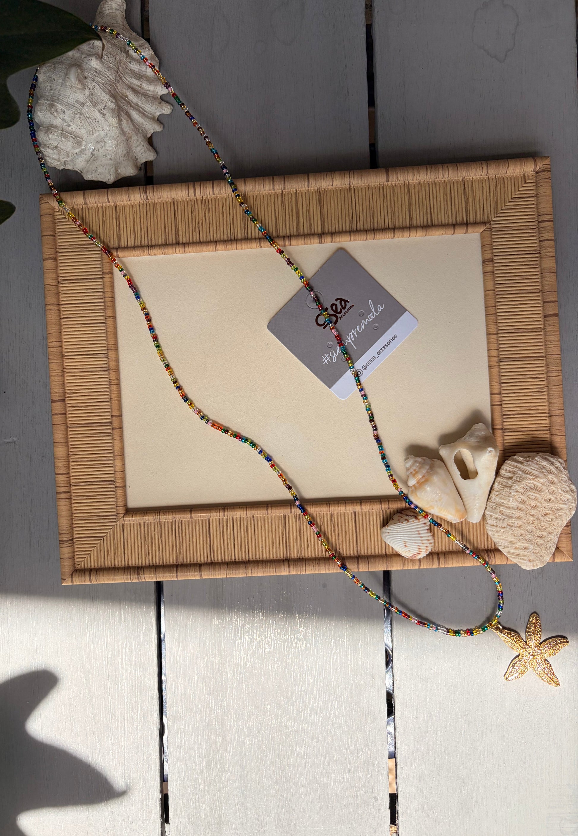 ¡Descubre tu estilo único con este hermoso collar largo hecho con mostacillas coloridas y un dije en forma de estrella! Lúcelo solo o combínalo con otros collares para un look increíble. ¡Expresa tu personalidad y atrae todas las miradas con este accesorio imprescindible!