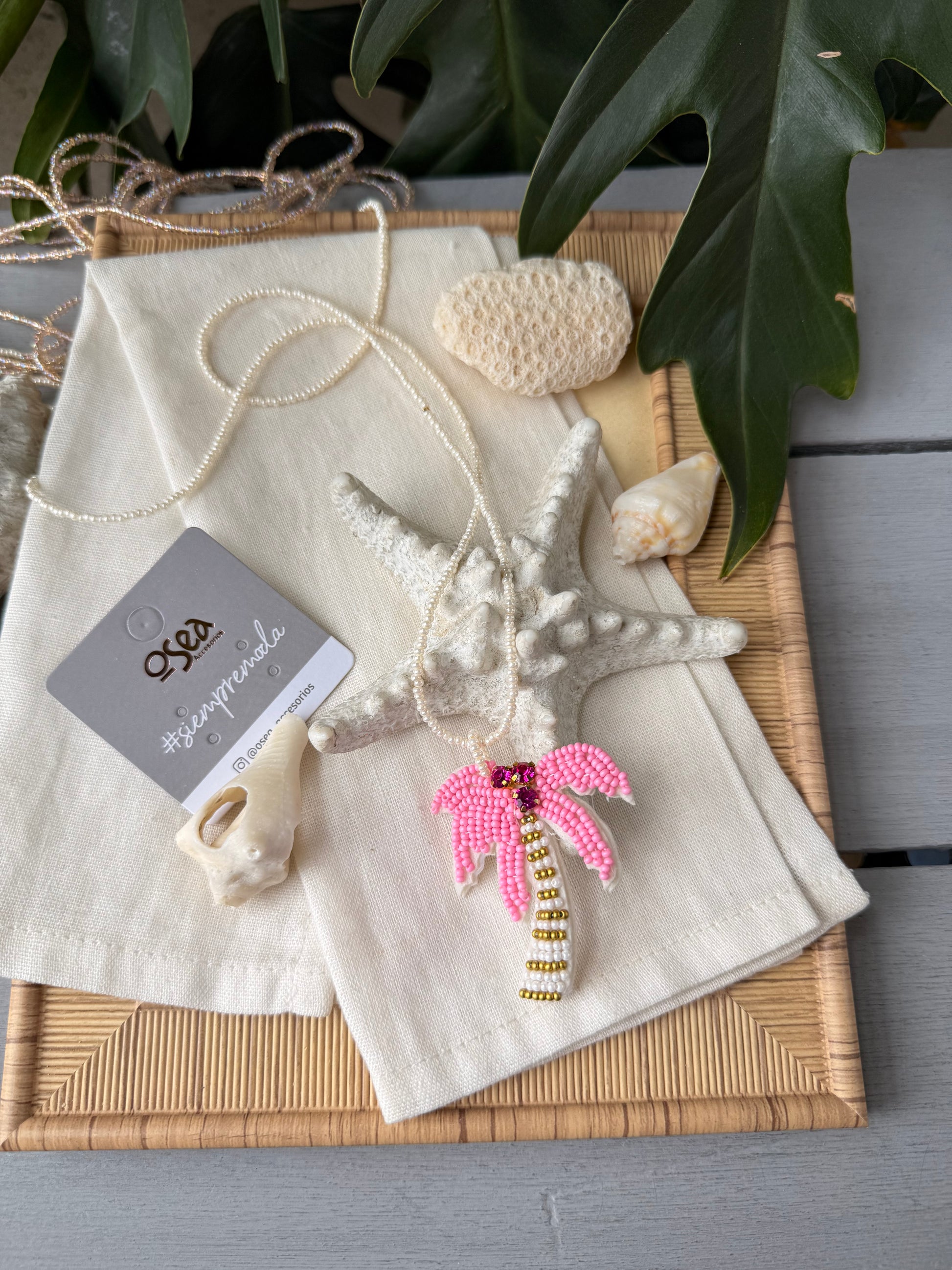 El collar palmera en mostacilla es un accesorio femenino en tendencia, diseñado con un largo elaborado a mano. Su dije en forma de palmera no solo añade un toque estético, sino que también refleja la artesanía cuidada. Ideal para realzar cualquier atuendo con un detalle distintivo y sofisticado.