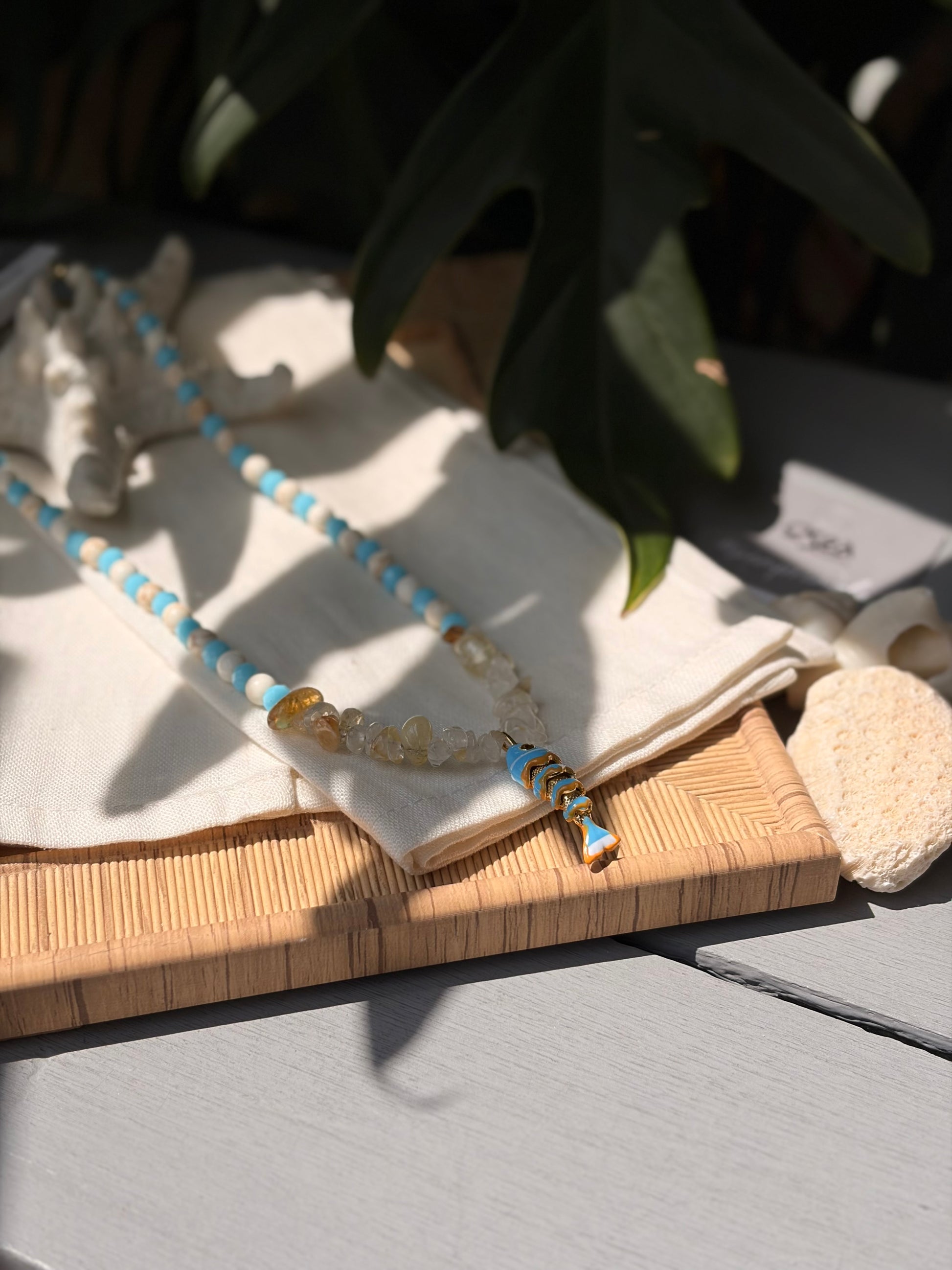 El Collar Pez Azul Piedras está elaborado con una combinación de piedras naturales picadas, fósiles y turquesa azul. Este diseño incluye un dije de pez en tonos azules y dorados, proporcionando un accesorio que combina estética y durabilidad. Ideal para quienes buscan un toque distintivo y elegante en su vestimenta.