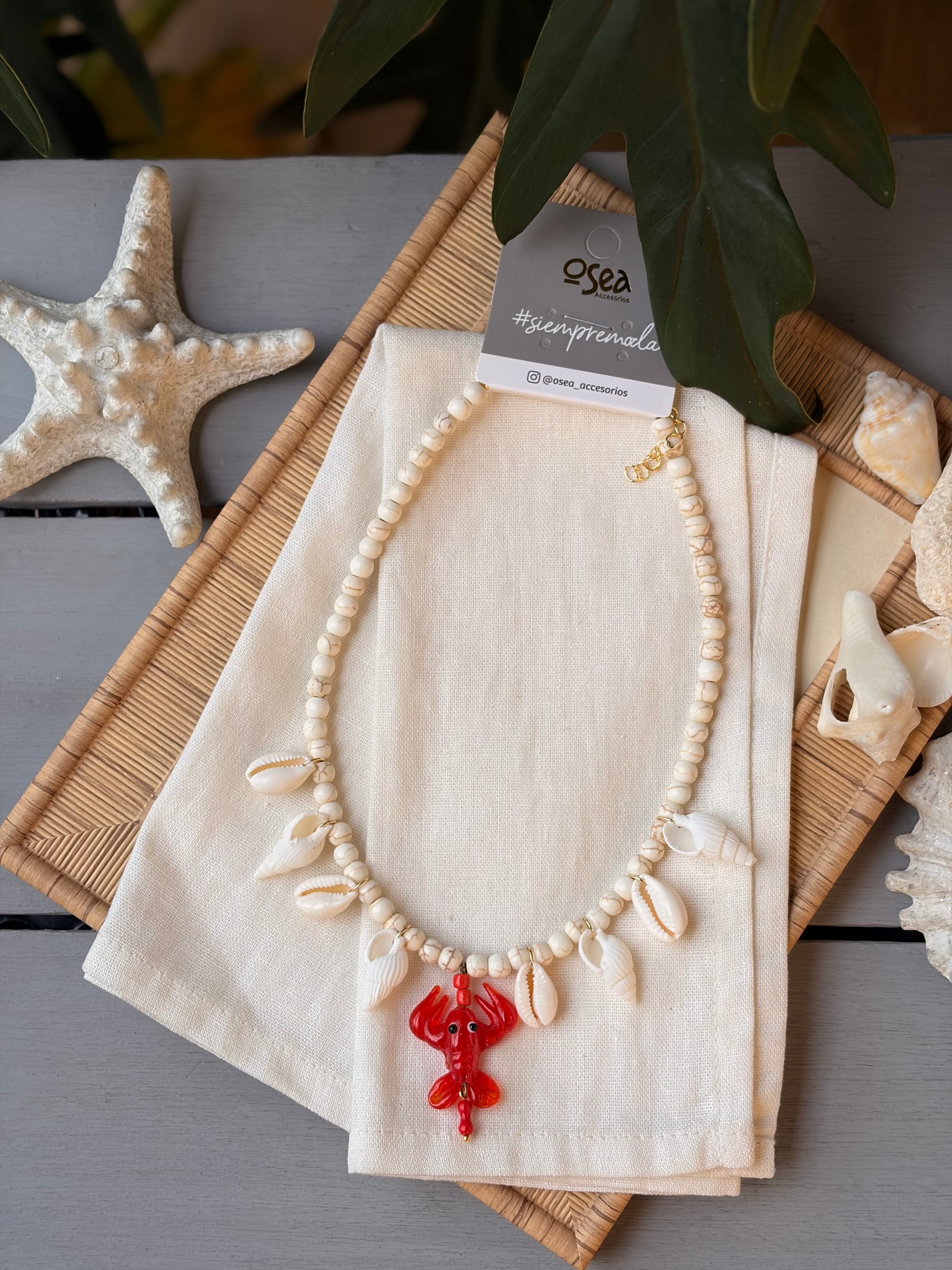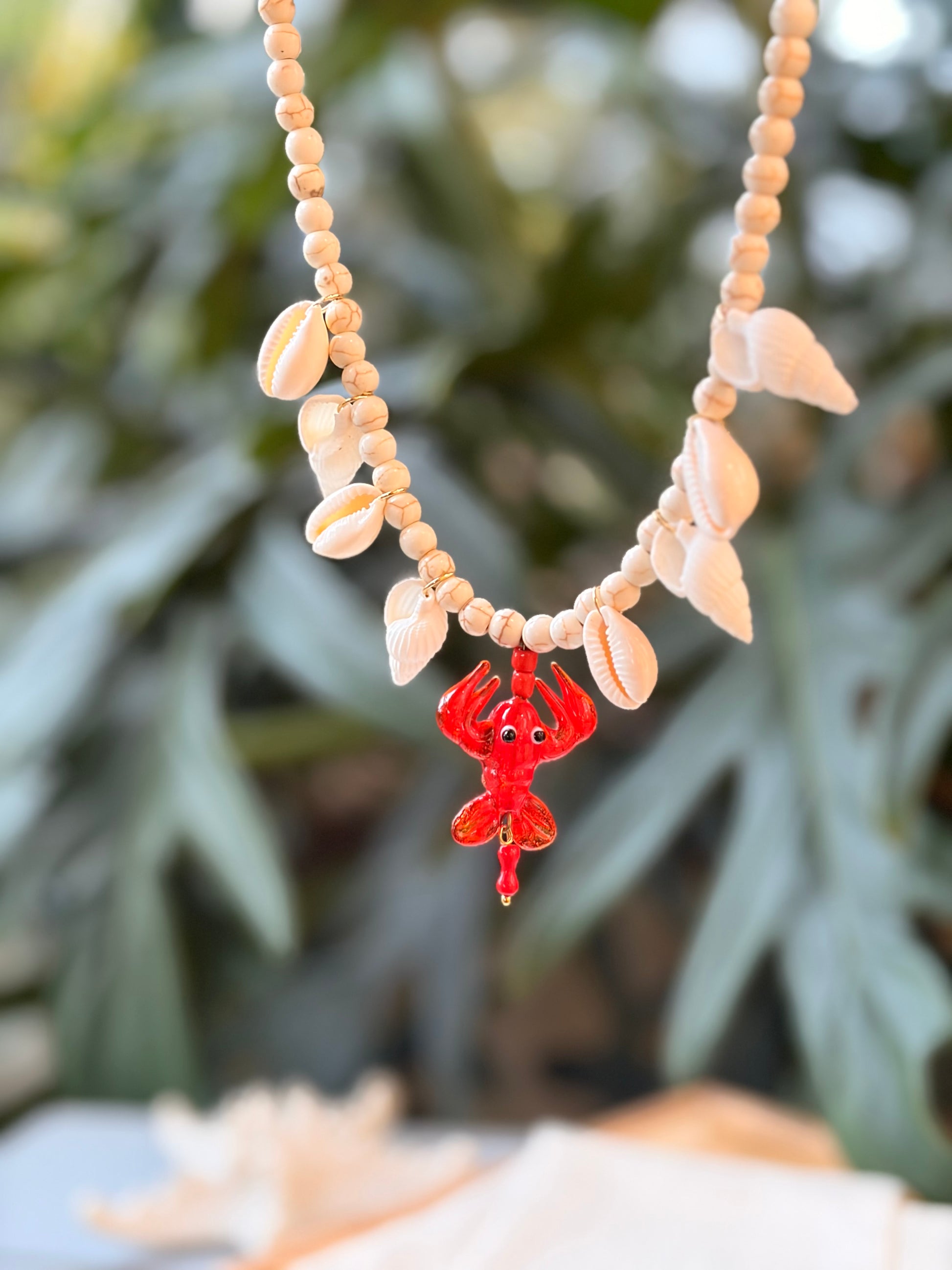 ¡Completa tu look veraniego con este hermoso collar hecho a mano! Confeccionado con piedra fósil y conchas, se destacará ese cangrejo en vidrio que cuelga de él. ¡Haz una declaración de estilo y lleva un pedacito del mar contigo a donde vayas!