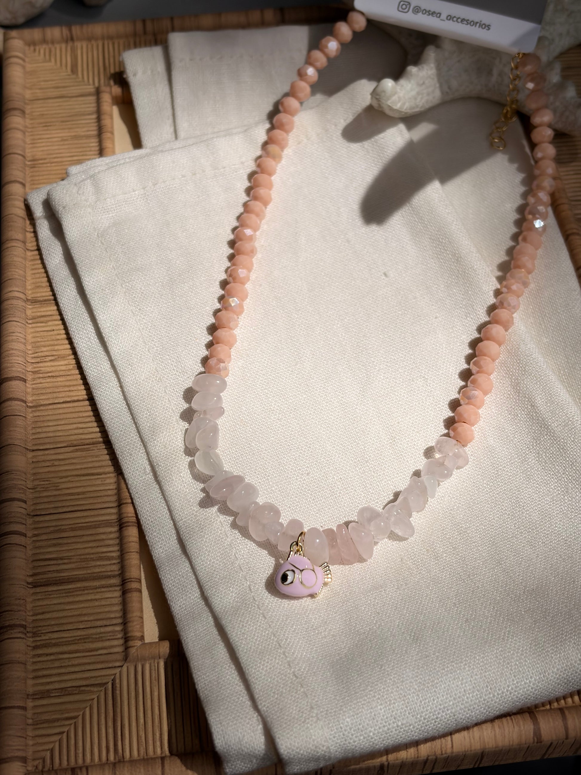 Collar piedras y dije pez tonos rosado