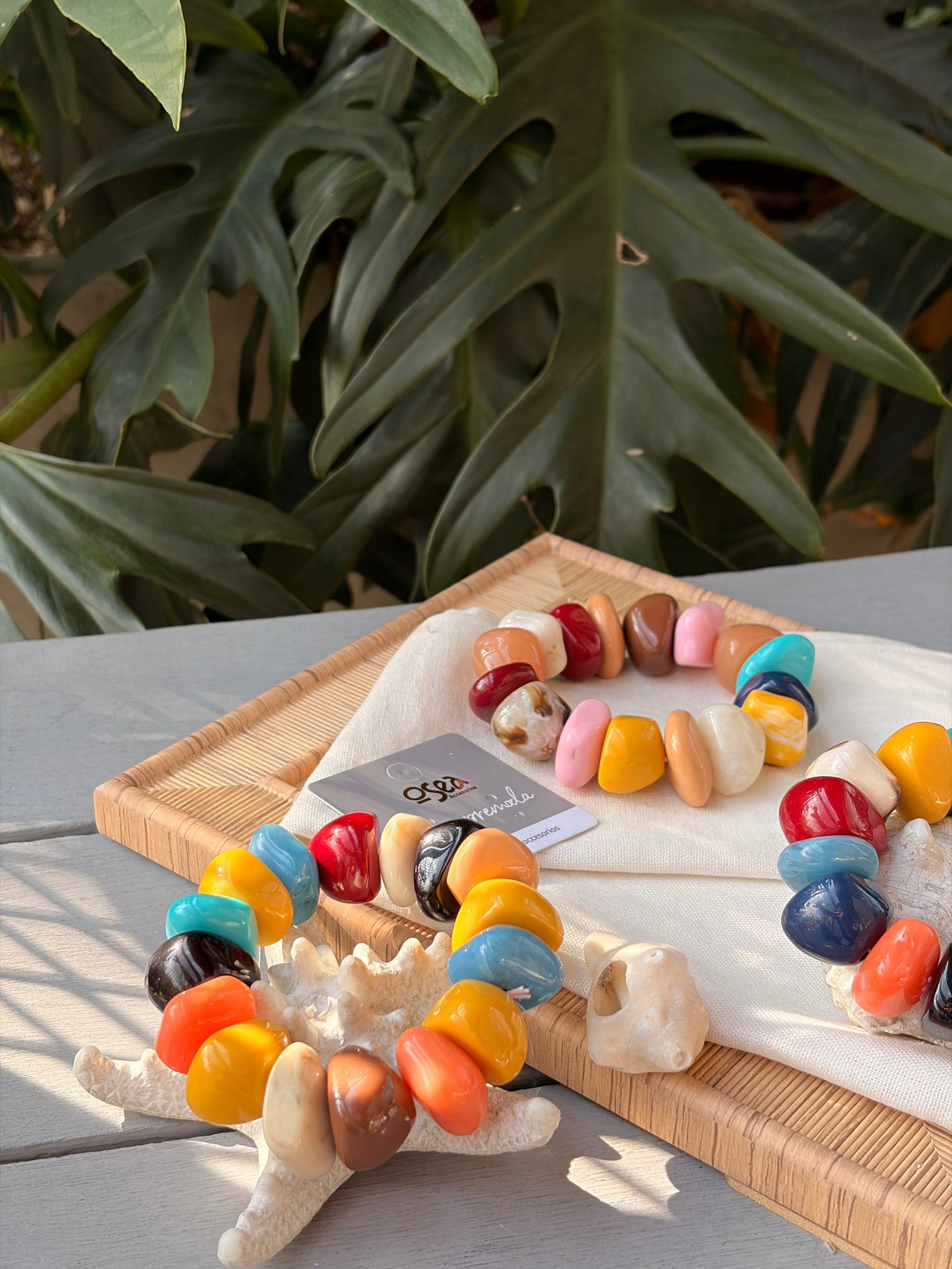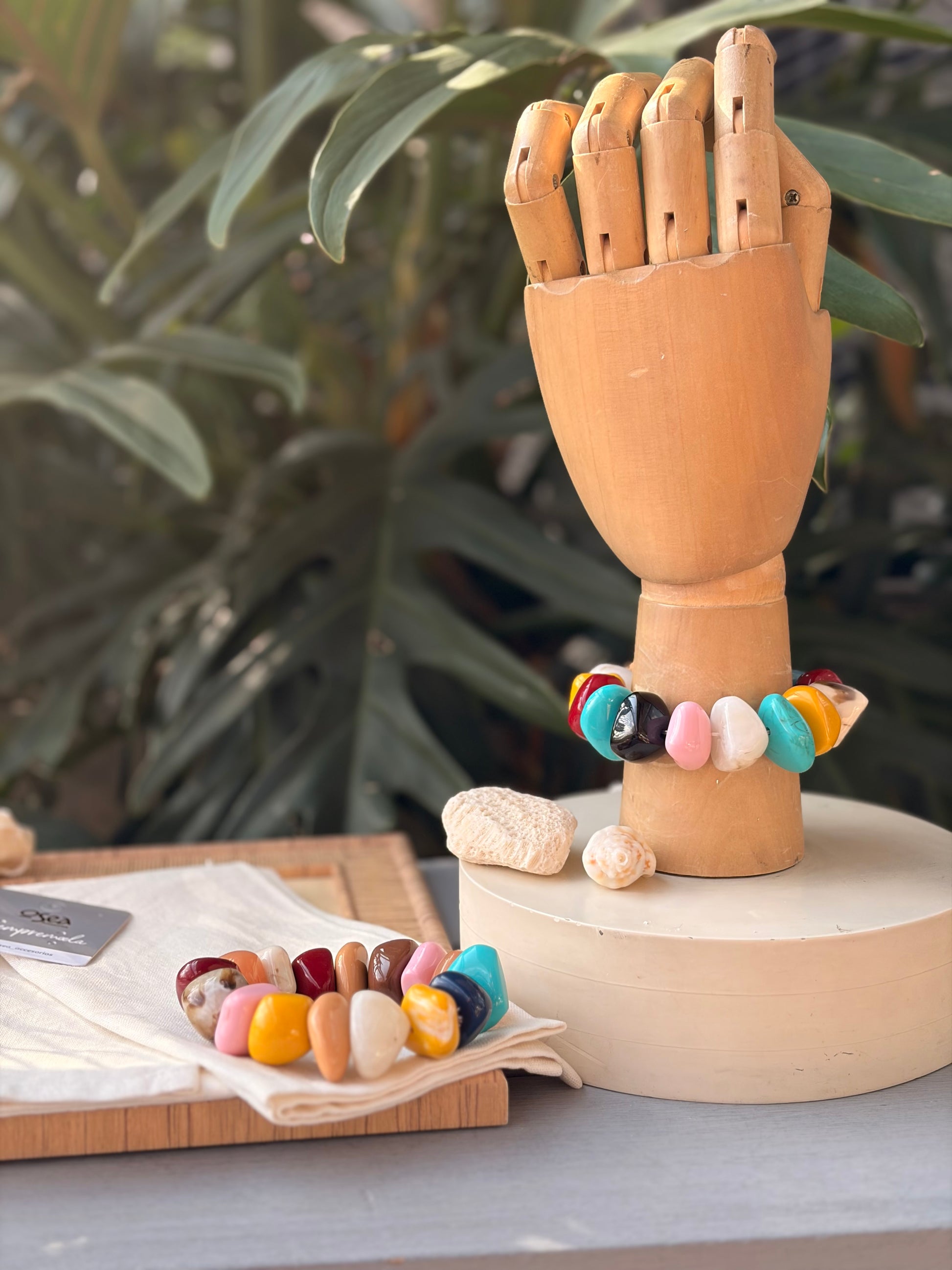 La pulsera de resina efecto piedras está diseñada con un resorte interno que garantiza un ajuste cómodo y seguro. Disponibles en una variedad de colores, estas pulseras no solo añaden un toque estético, sino que también ofrecen durabilidad y resistencia al desgaste.