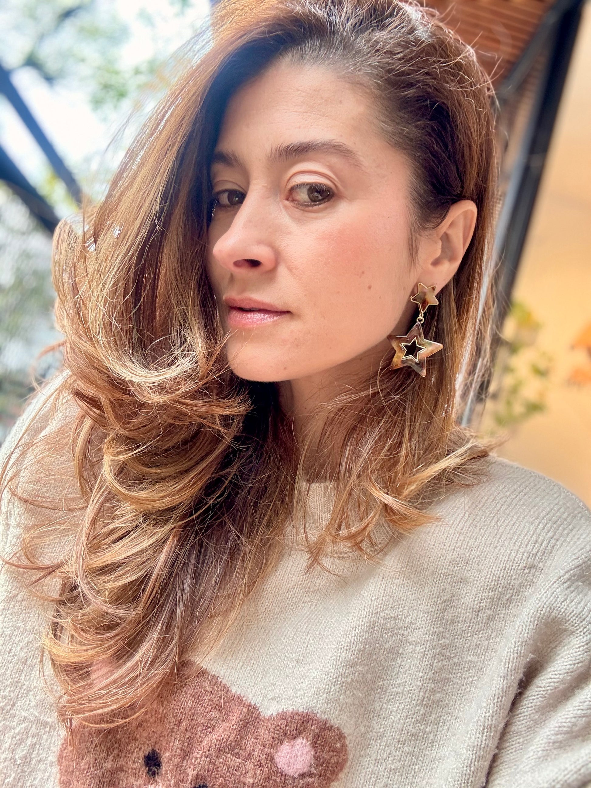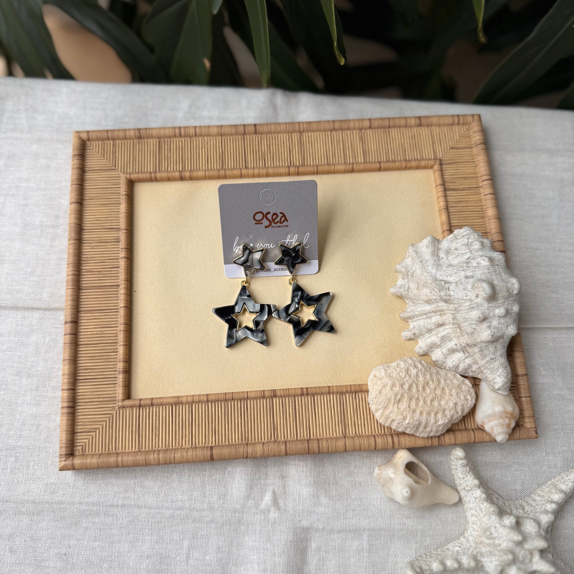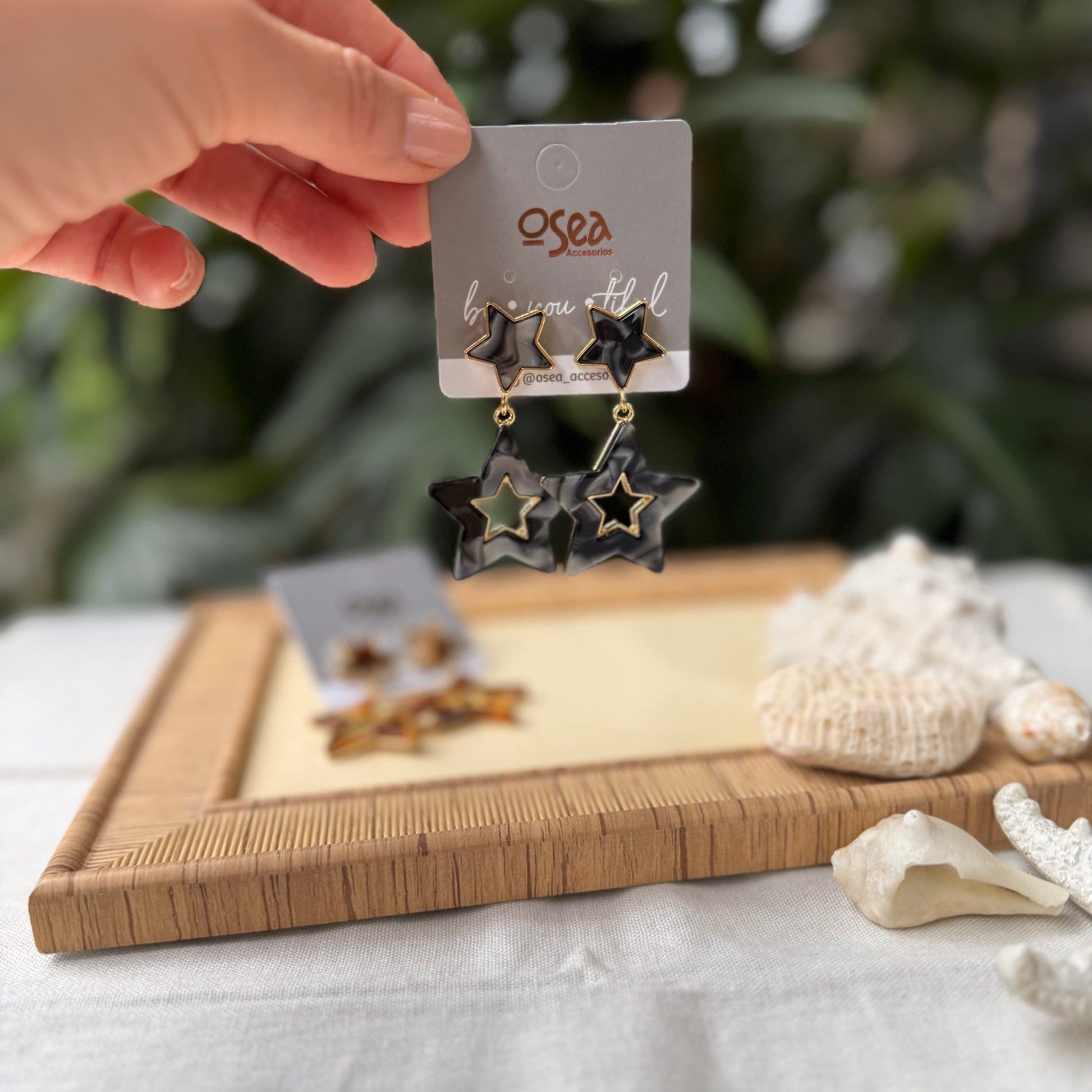 Resalta tus looks con mucho estilo con estos aretes de doble estrella con base en fantasía y aplique en resina en tonos animal print, ideales para esos looks que va más allá de solo vestir.