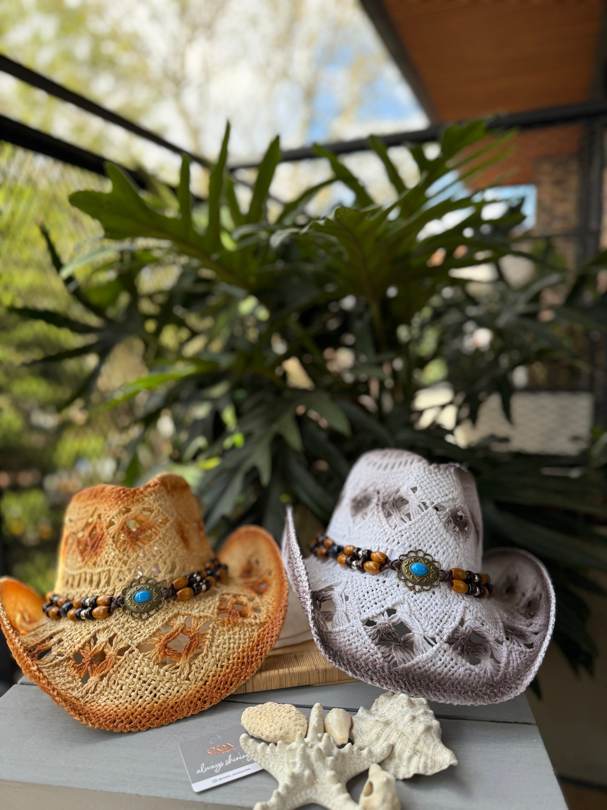 Luce fabulosa con este sombrero en tendencia en fibras tejidas en macramé con toques de aerógrafo y correa con herraje y maderas.